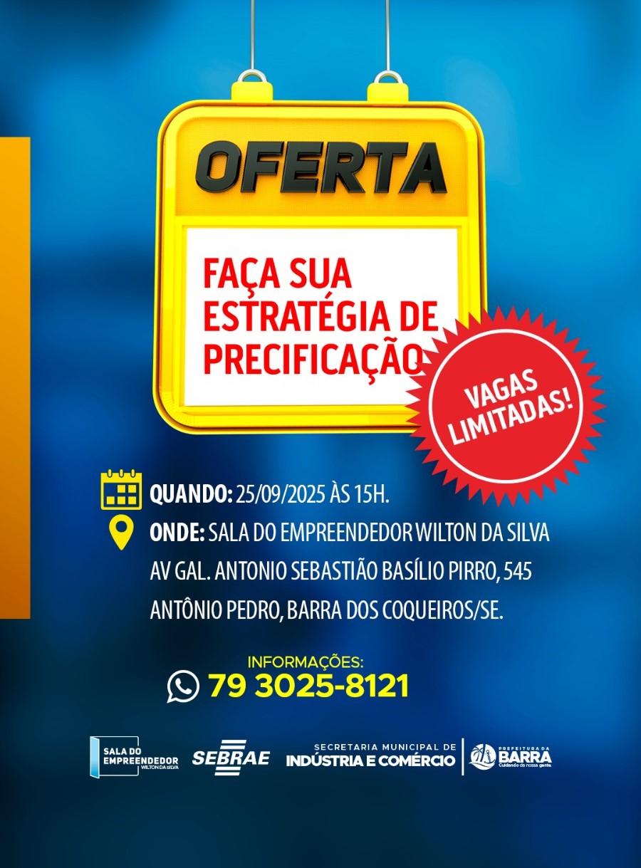 A Prefeitura de Barra dos Coqueiros, em parceria com o Sebrae, está oferecendo uma importante oportunidade para os empreendedores do município. Na quinta-feira, 25, será realizada a oficina “Faça sua Estratégia de Precificação”, na Sala do Empreendedor Wilton da Silva.