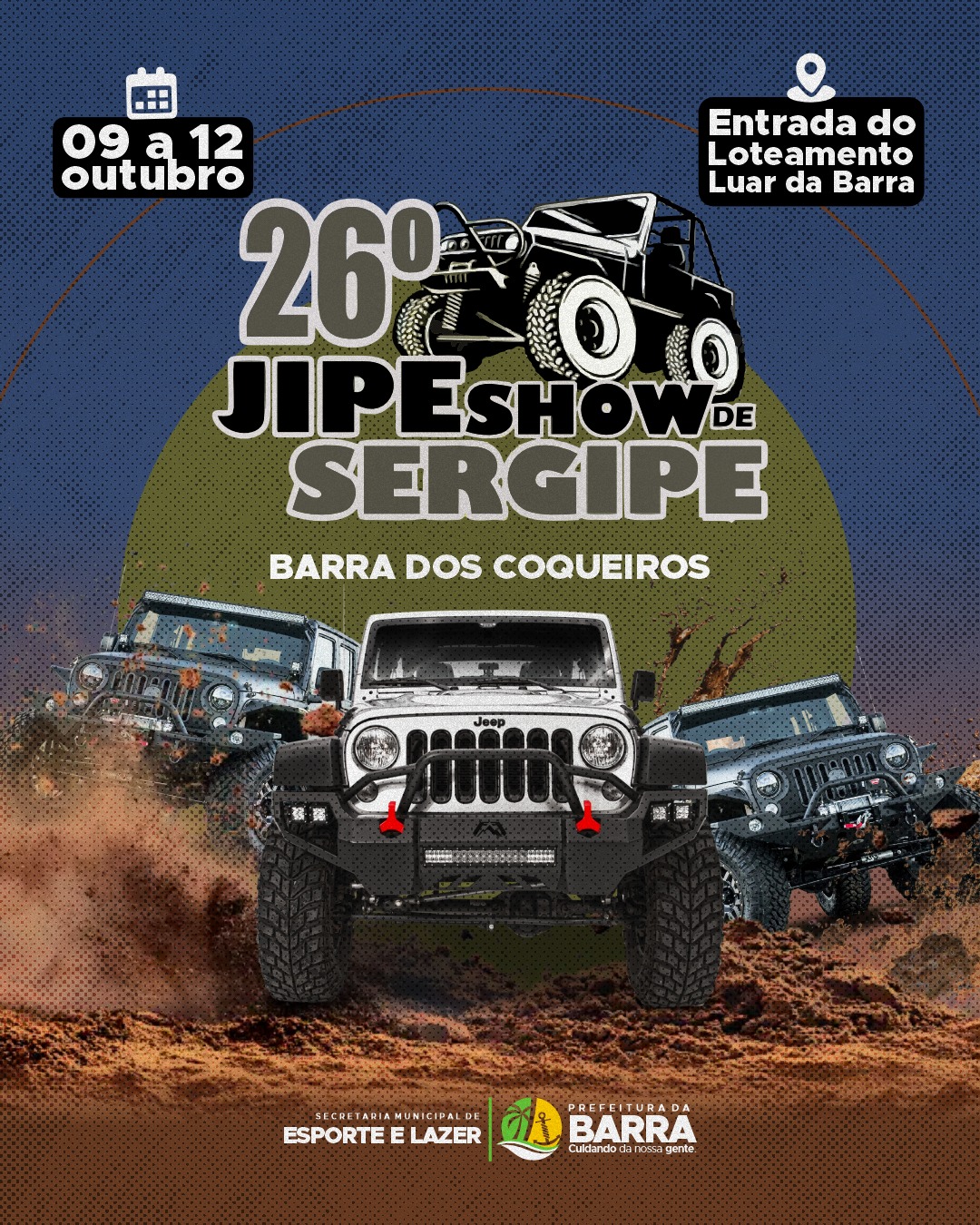 Com apoio da Prefeitura, por meio da Secretaria Municipal de Esporte e Lazer, a Barra dos Coqueiros sediará o 26º Jipe Show de Sergipe, um dos maiores eventos off-road do estado. O evento acontecerá de 9 a 12 de outubro, na entrada do Loteamento Luar da Barra.