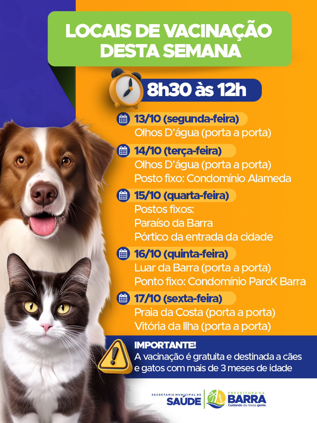 A ação tem como objetivo proteger os animais contra a raiva, uma doença grave e letal que pode ser transmitida aos humanos. As equipes de imunização estarão percorrendo diversos bairros do município, com atendimento porta a porta e em postos fixos, sempre das 8h30 às 12h.